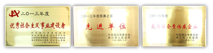 企業(yè)慈善義舉得到社會肯定,榮獲靖江市“優(yōu)秀社會主義建設(shè)者”、“慈善之星先進(jìn)單位”、“最具社會責(zé)任感企業(yè)”